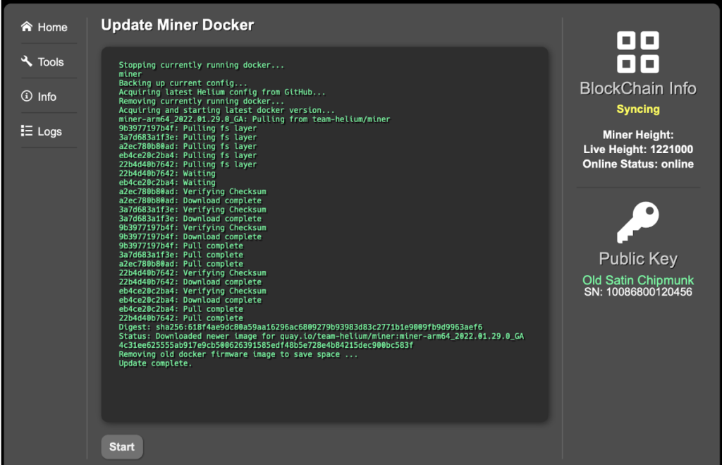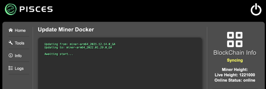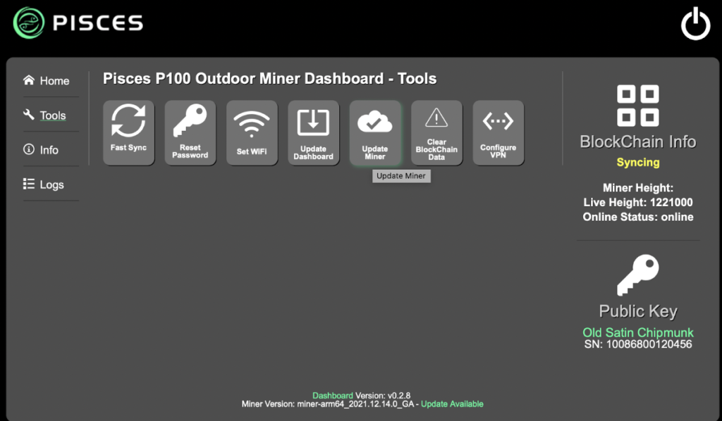 - Update Miner: under the ‘Tools’ tab, hit ‘update miner’. You should see:
